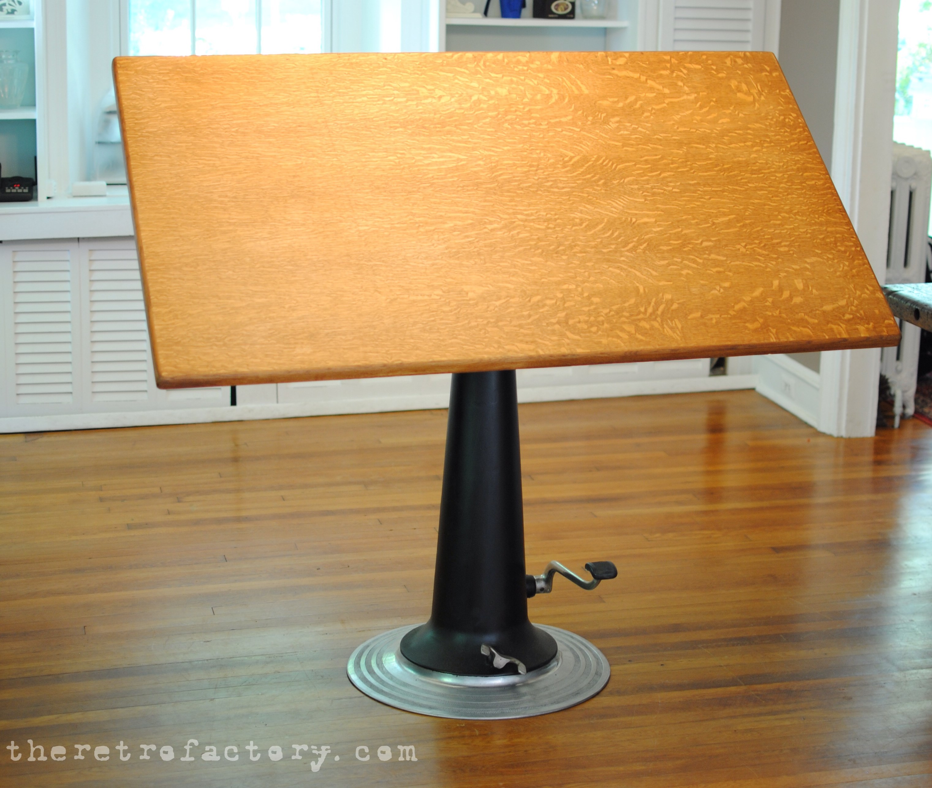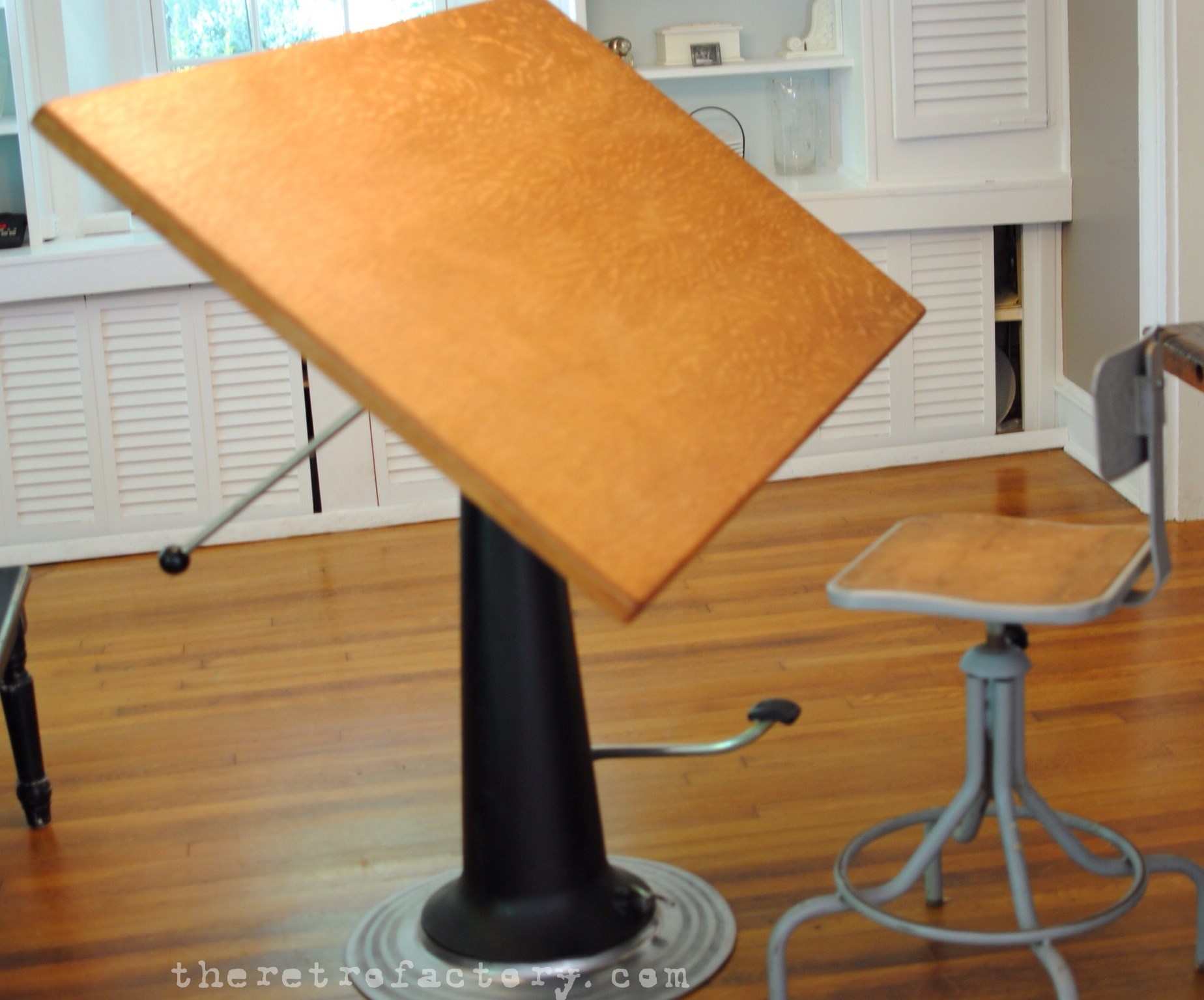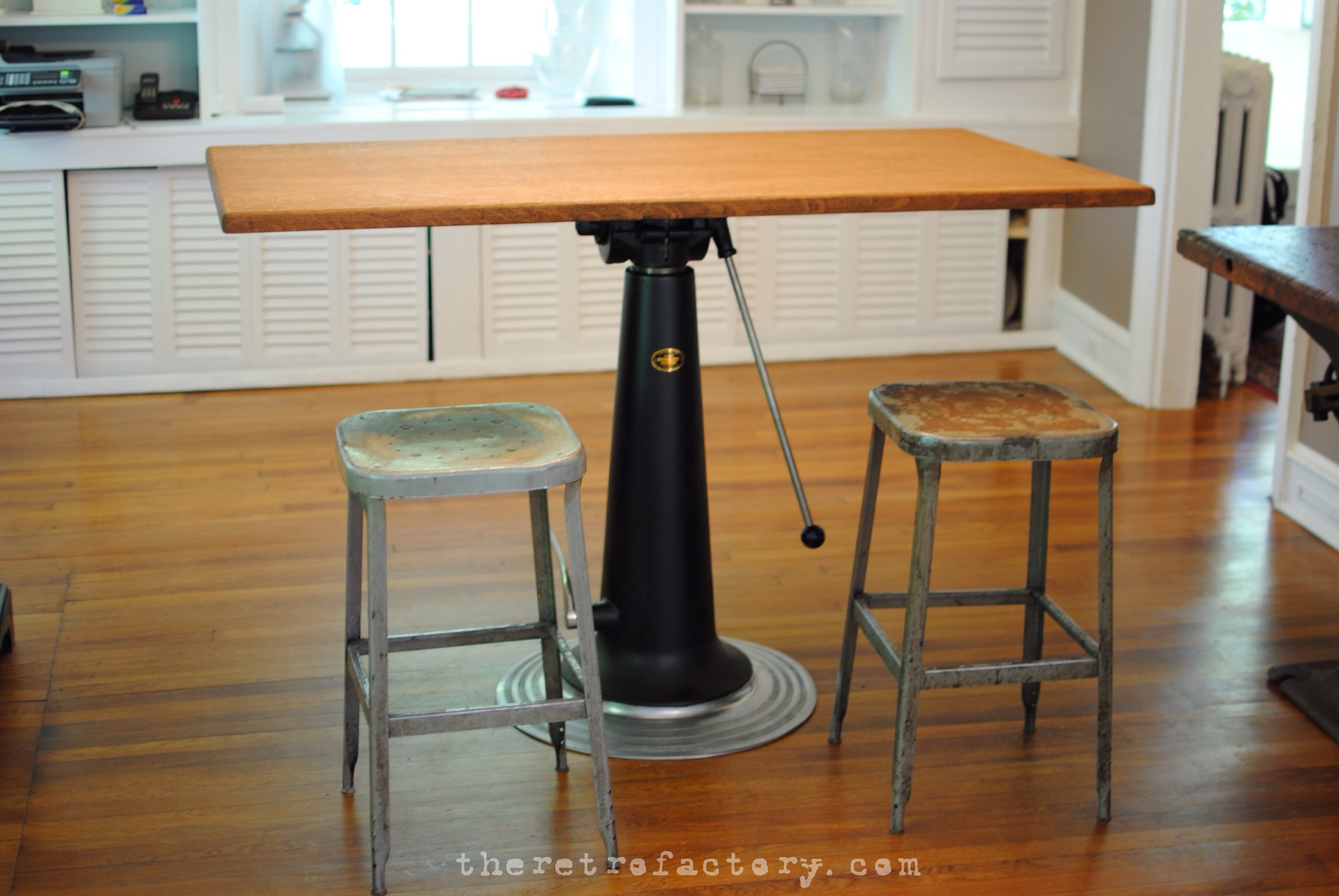 This would make a terrific “sit or stand desk”, a nice adjustable height pub desk  (sits 39″ off the floor at lowest position, and adjusts way up from there) or as a drafting table-it comes with an aluminum pencil stop and vintage Viking drafting arm included.