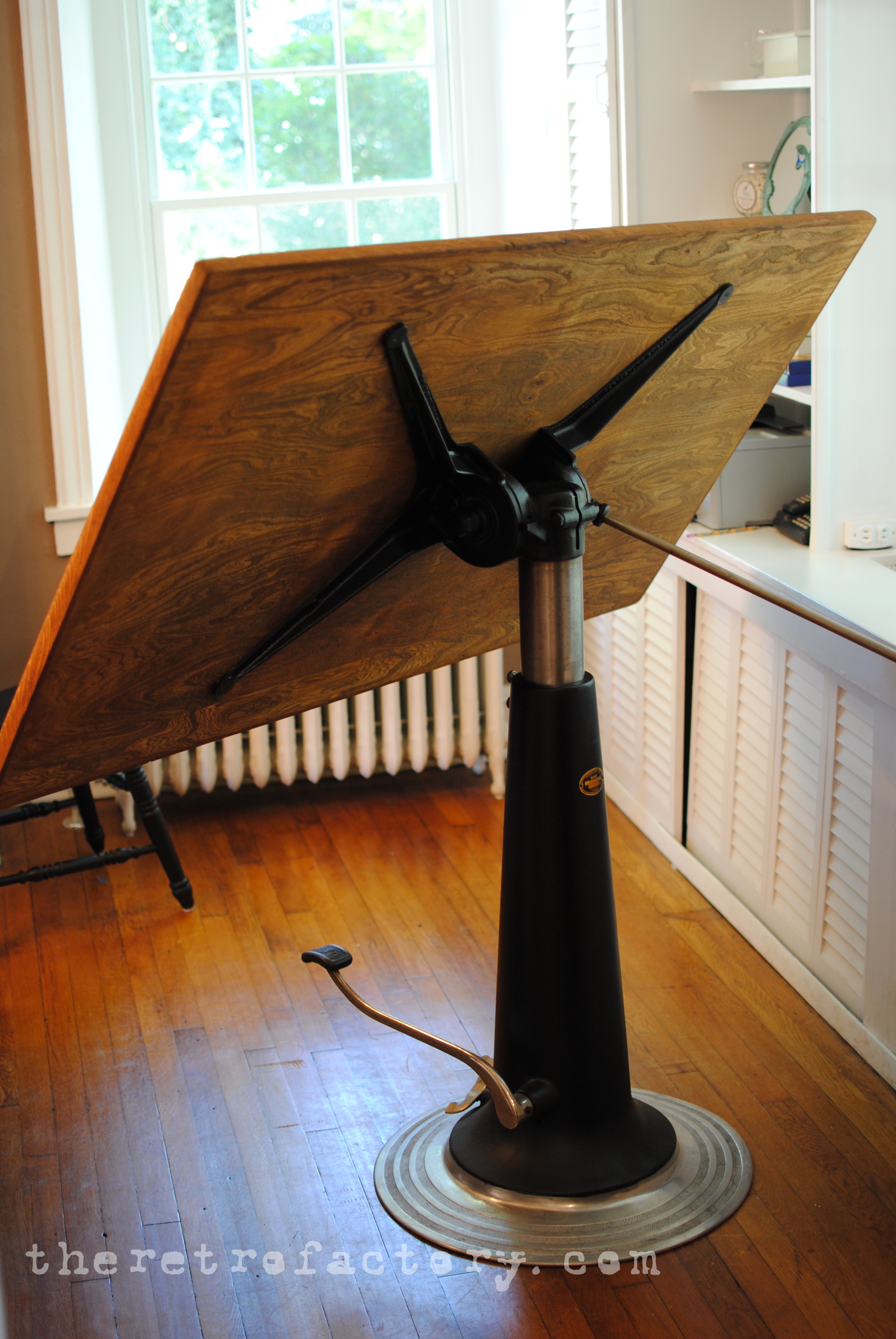 At long last, a mid century Swedish made Nike hydraulic drafting table has found its way to the RetroFactory. These are amazing pieces of machinery masquerading as elegant pieces of furniture.photo 3 (6) The large foot pedal smoothly raises the work top up or down, while the small silver foot lever is the release which allows the entire table to rotate 360 degrees, (presumably to show Sven at the next workstation your newest rendering). The large silver lever is the table lock, which is spring loaded to permit easy angle changes-converting it from drafting table to desk or anywhere in between with a pull of the lever.