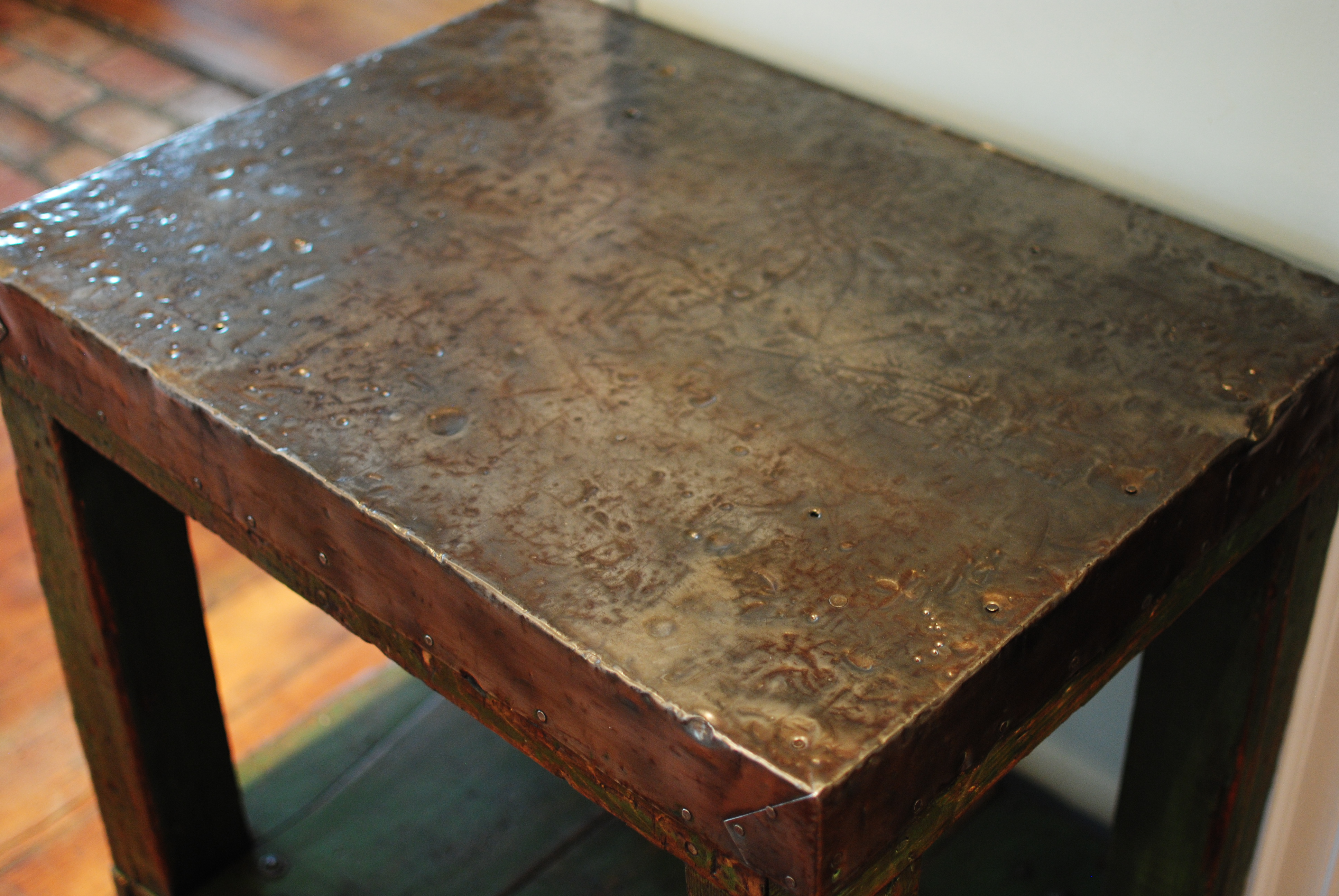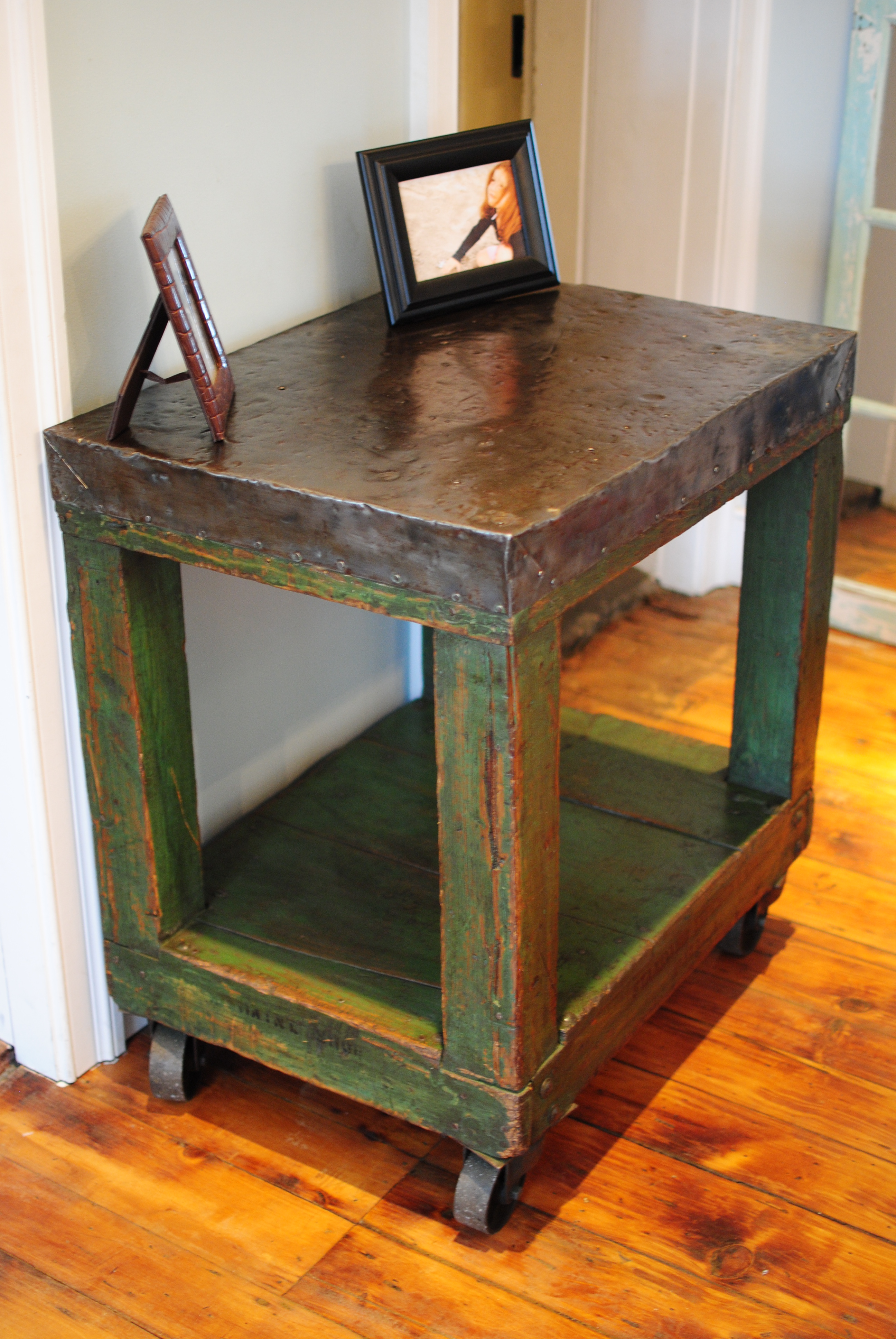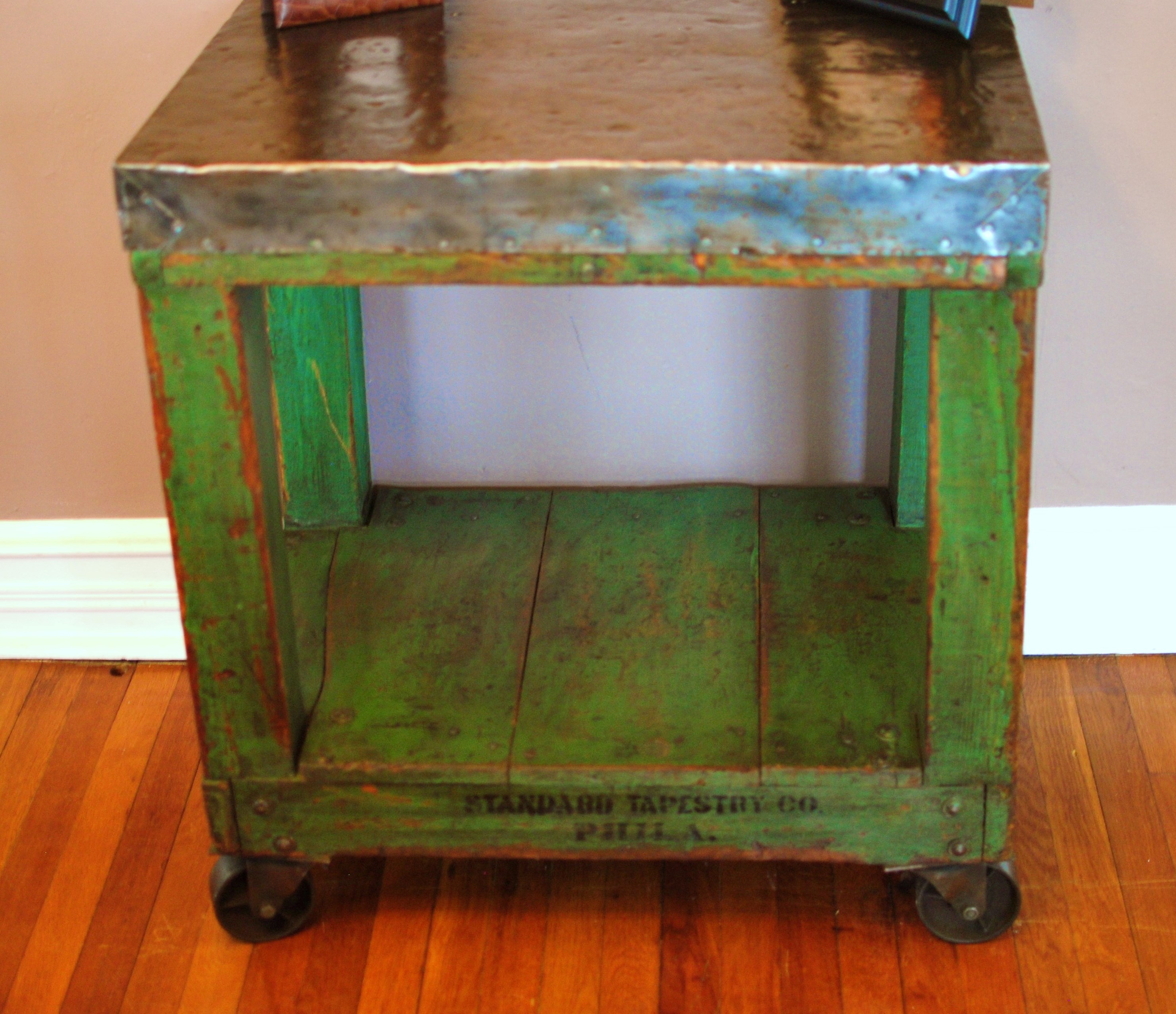 Made sometime in the ’40’s. it has soft green paint and original stencils. It’s been thoroughly cleaned, and then waxed to protect the patina of the paint and metal. The original top is wrapped skillfully in tin, and over the last 50 or so years has acquired a wonderful patina, full of dents and dings acquired in the old factory. I can make out faint “Maint. Shop” stenciling on the ends, and ‘Standard Tapestry Phila” is on both sides at the bottom. Would make a fine table in almost any room, and rolls easily on cast iron casters. It’s 32″ tall, 30.1/4″ wide, 22.1/4″ deep.       $850