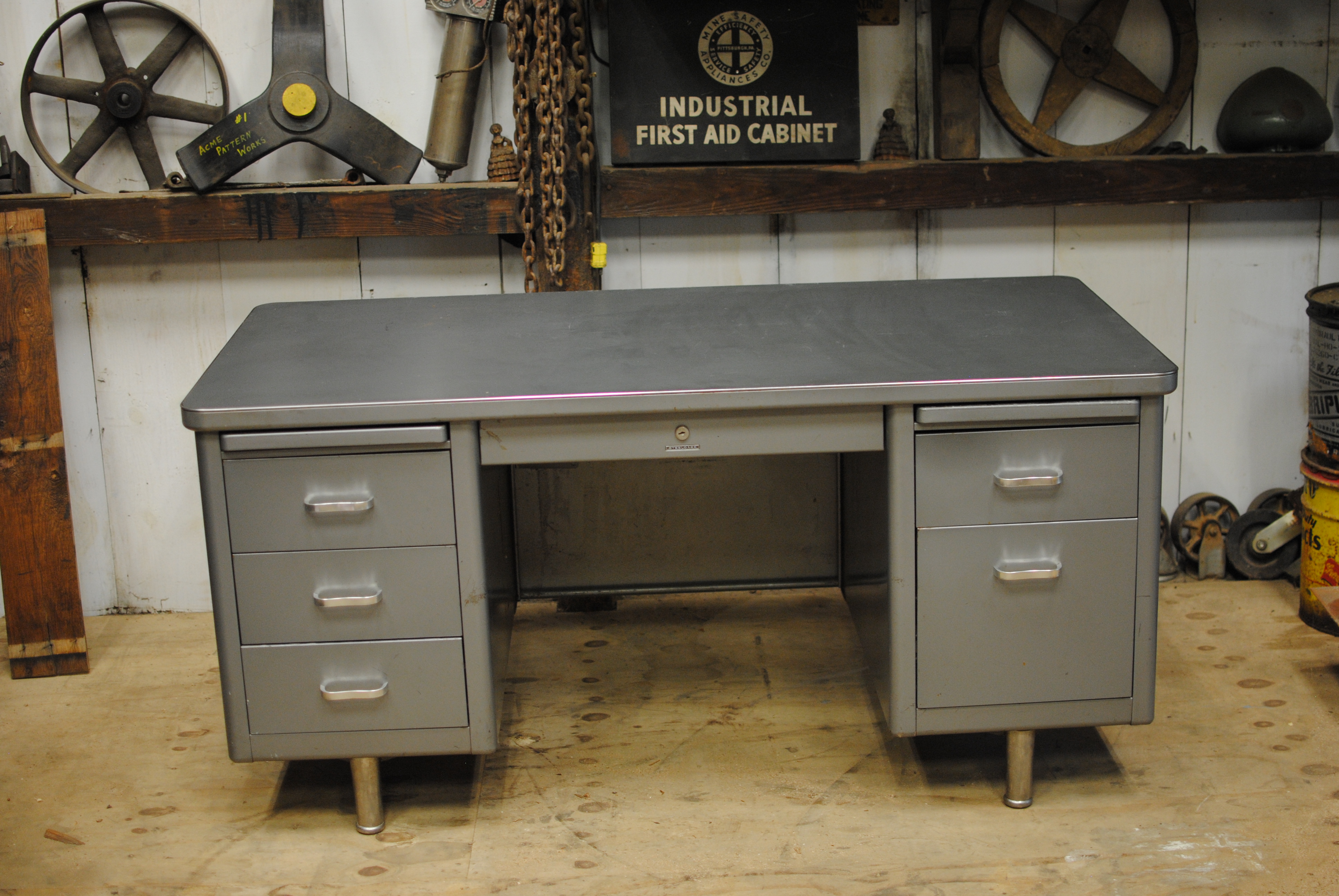 Really nice example of a “Tanker” desk, made in the ’50’s by Steelcase. 60″x30″.
